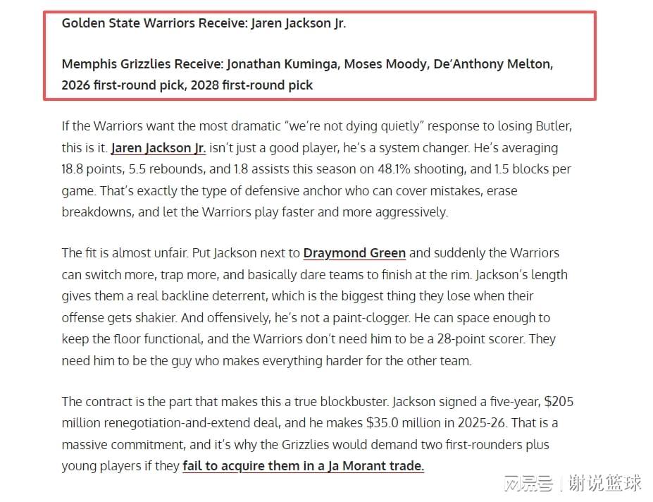 那么如果同时保留库里、巴特勒和追梦格林,勇士调整空间就很小了,不过美媒还是出谋划策,支招勇士做5换1交易。从具体方案来看,勇士可以追求灰熊内线小贾伦-杰克逊,只不过代价有点大,需要出三替补库明加、穆迪和梅尔顿,再加上两个首轮签。