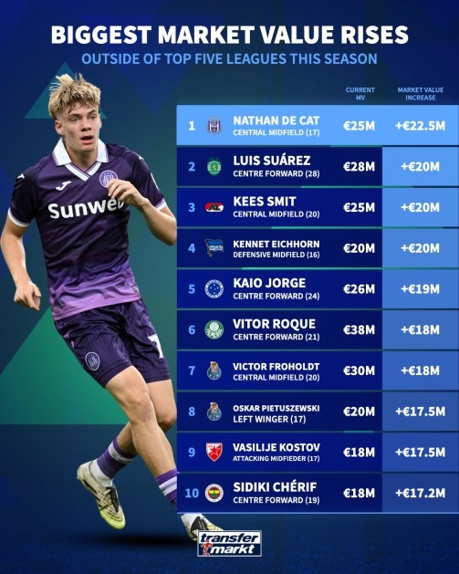 本赛季五大联赛外球员身价涨幅榜:德卡特+2250万欧居首