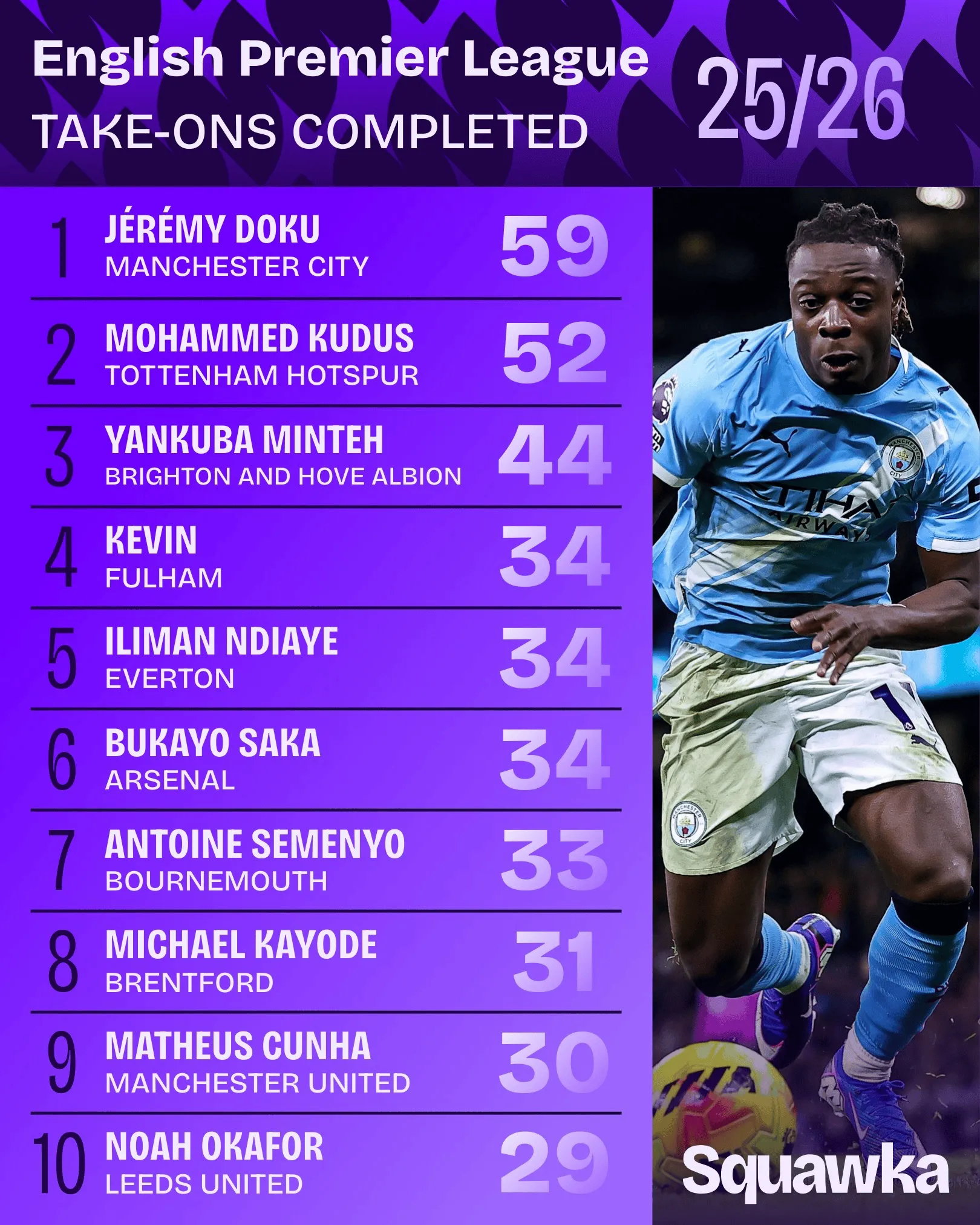 虎扑01月10日讯 英超前21轮比赛结束,数据网站也统计了英超目前的过人榜。具体榜单如下:1.多库(曼城)59次2.库杜斯(托特纳姆热刺)52次3.扬库巴-明特(布莱顿)44次4.凯文(富勒姆)34次5.恩迪亚耶(埃弗顿)34次6.萨卡(阿森纳)34次7.安托万-塞梅尼奥(伯恩茅斯→曼城)...