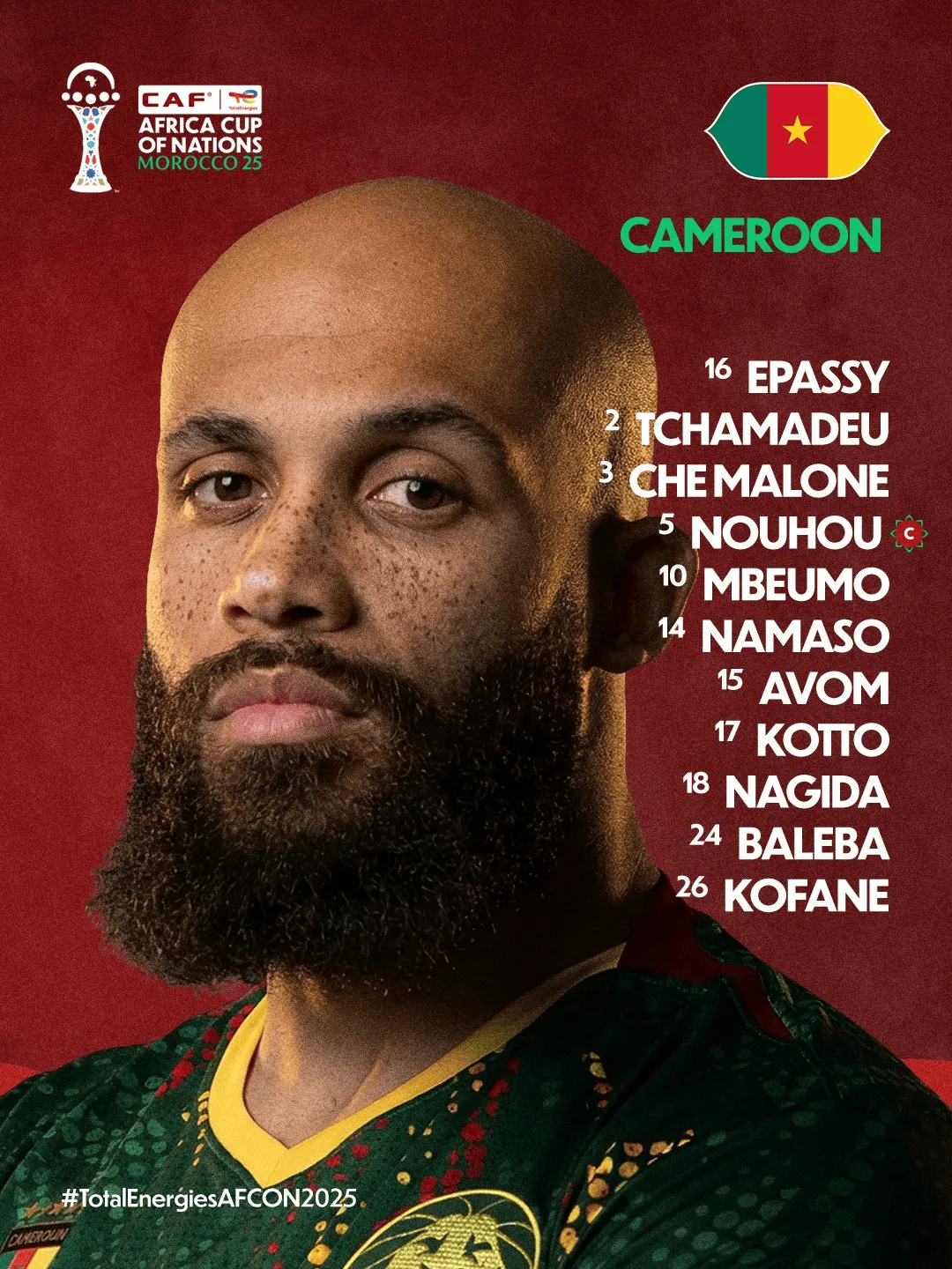 喀麦隆首发:16-姆博卡、3-马洛内、17-塞缪尔-科托、5-努胡-科洛、2-查马德乌(洛里昂)、15-埃邦(洛里昂)、24-巴莱巴(布莱顿)、14-纳马索(欧塞尔)、18-纳吉达(雷恩)、10-姆伯莫(曼联)、26-科法内(勒沃库森)